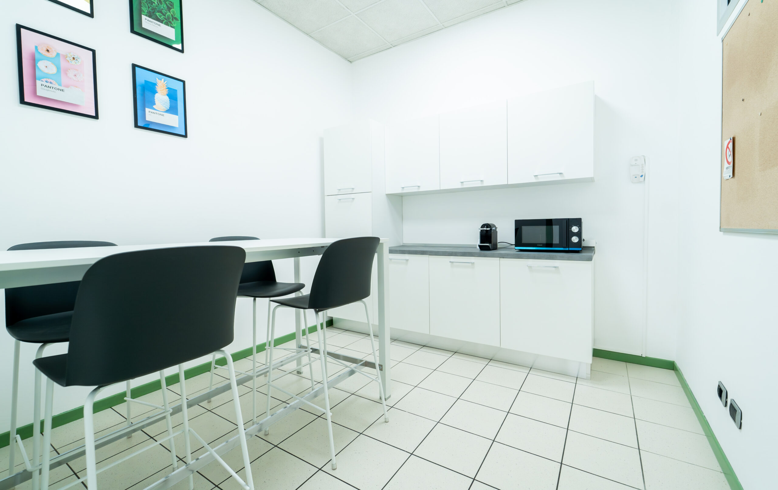 Area ristoro attrezzata con forno a microonde, frigorifero e servizio caffè, sempre disponibile per le tue pause di lavoro.